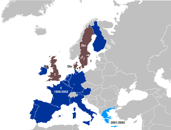 Позже, в 2000 году, Дания провела референдум по вопросу отказа от евро. Референдум привел к решению сохранить крону, а также отложены планы проведения референдума в Великобритании.[18] Процедура, используемая для установления безвозвратного конверсионного курса 340,750 между греческой драхмой и евро, была иной, поскольку евро к тому времени было уже два года. В то время как курсы для первоначальных одиннадцати валют были определены всего за несколько часов до введения евро в качестве виртуальной валюты, курс для греческой драхмы был установлен за несколько месяцев до этого в постановлении Совета 1478/2000[19] (Европейского Сообщества) от 19 июня 2000 года.