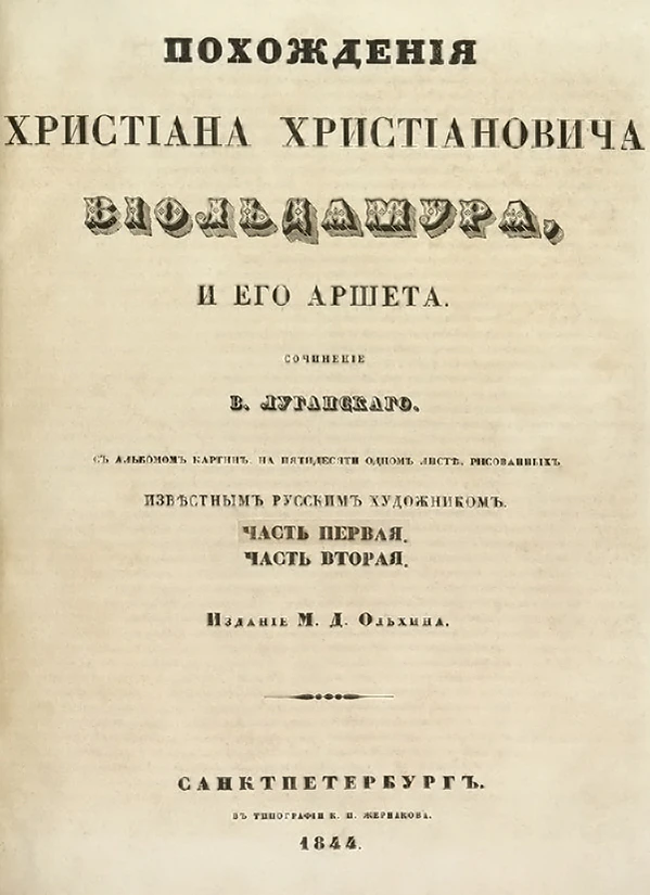 - 1844 — Издаётся альбом гравюр «Похождения Христиана Христиановича Виольдамура и его Аршета» художника-любителя Андрея Сапожникова. Первоначально им было выполнено 50 юмористических и одновременно документально точных картин, к которым он предложил Владимиру Далю написать текст. В повести, рассказывающей о бездельнике, возомнившем себя музыкантом-виртуозом, даётся описание быта жителей Петербурга и губернского города[10]. Эта книга не является комиксом в чистом виде, но это, вероятно, первое русское литературное произведение, где текст и иллюстрации неразрывно связаны.