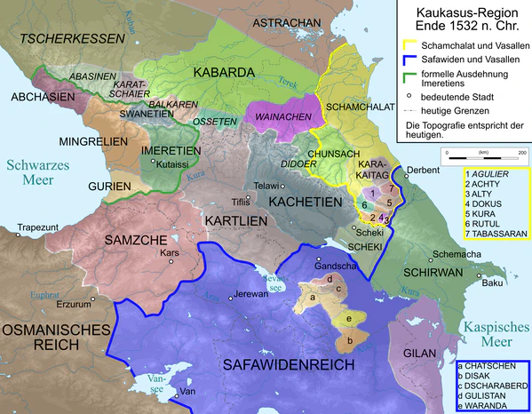 Усиление шамхальства относится к 16-17 векам. При шамхале Чопане I государство владело «всем краем от границ Кайтака, Кюринского округа, Аварии, Черкесии и реки Терека до моря Каспийского»[61]. Великие мусульманские державы того времени понимали важное значение правителей кумыков и стремились склонить их на свою сторону. Шамхальство в период могущественного шамхала Чопана ибн Будая входило в состав Османской империи и участвовало в боевых действиях против Сефевидов в Ширване.