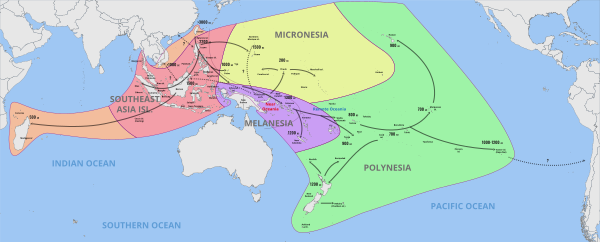 На востоке первым настоящим океанским путешествием стала колонизация Северных Марианских островов Микронезии с Филиппин. За этим последовали дальнейшие миграции на юг и восток, в островную Меланезию, вплоть до островов за пределами межостровной зоны видимости, таких как Тонга и Самоа. Этот регион был занят австронезийской культурой лапита. После примерно двухтысячелетнего перерыва первые полинезийцы продолжили распространяться на восток, на острова Кука, Французскую Полинезию, Гавайи, остров Пасхи и Аотеароа (Новая Зеландия) примерно к 700—1200 гг. н. э.[22][27][28].