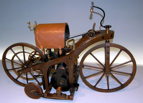 Первый мотоцикл с двигателем внутреннего сгорания (Daimler Reitwagen) был построен в 1885 году в Германии немецкими инженерами Готлибом Даймлером и Вильгельмом Майбахом, впоследствии — «отцами» знаменитых автомобильных марок. Машина создавалась всего лишь как простейший стенд для испытаний изготовленного изобретателями двигателя будущих четырёхколёсных экипажей и напоминала первые беспедальные велосипеды-«костотрясы» начала XIX века. Бензиновый карбюраторный двигатель Даймлера и Майбаха имел мощность 1,5 л. с. и был установлен на деревянной раме с деревянными колесами. При испытаниях аппарат развил скорость 12км/ч. В том же 1885 году Даймлером был получен патент на «повозку для верховой езды с керосиновым двигателем». Таким образом, классический мотоцикл появился раньше классического автомобиля с ДВС (1886). Фирма Даймлера более к конструированию мотоциклов никогда не возвращалась. Исторический мотоцикл сгорел при пожаре в мастерской Даймлера в 1904 году. Однако к столетию мотоцикла, в 1985 г., изготовлено порядка десятка ходовых реплик для демонстрации на шоу и в музеях. В музее концерна Daimler-Benz в Штутгарте выставлена также реплика.