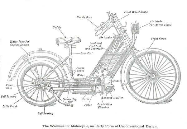 Самодвижущиеся двухколёсные машины стали появляться в 60-х годах XIX века. Единственная доступная в то время силовая установка — паровая машина — уже могла быть достаточно компактной для установки на лёгкий двухколёсный экипаж. Однако малая удельная мощность (двигатель парового мотоцикла Коупленда (1884 г.) развивал всего 0,25 лс при весе 9 кг), непрактичность из-за длительного разведения паров и крайне малый КПД (единицы процентов) обусловили появление лишь единичных экспериментальных образцов. Служившие базой для них примитивные велосипеды целиком из металла или с деревянными элементами, с педальным приводом непосредственно на переднее колесо были тяжелы и некомфортны.