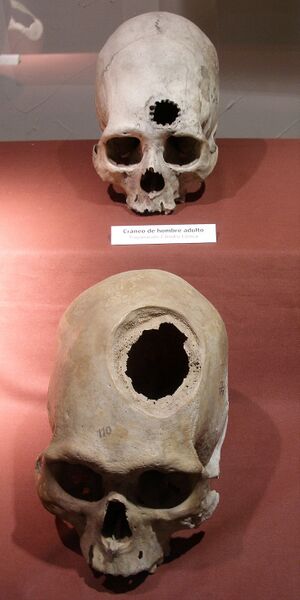 Она также широко практиковалась в доколумбовых Андах[7][8]. Эти процедуры в основном проводились на комбатантах, и свидетельства, полученные из останков скелетов, показывают, что самые ранние методы обычно приводили к смерти[8]. Однако к 1400-м годам инки проявили себя «опытными хирургами»: выживаемость возросла до 90 %, частота инфекций после процедуры была низкой, и были найдены свидетельства того, что некоторые люди переживали операцию несколько раз[8]. Хирурги инков научились обходить области головы, которые могли бы вызвать травмы, используя метод соскабливания черепа, который причинял меньше травм[8]. Вероятно, они также использовали лекарственные травы того времени, такие как кока и алкоголь для обезболивания, а бальзам и сапонин — в качестве антибиотиков[8].