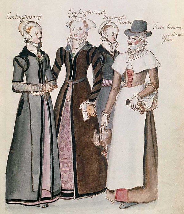 Ренессанс охватил все страны Европы. Новые тенденции: мягкие ткани, глубокие декольте и широкие рукава. Мужчины носят плоские шляпы с перьями.