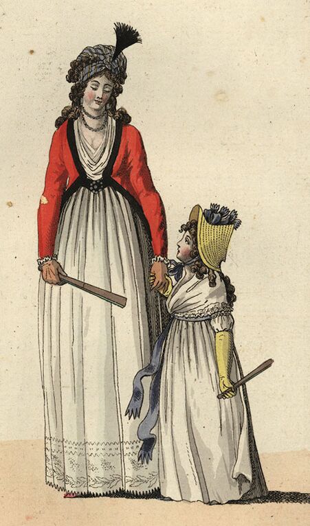 Из Франции распространяется ампирная мода, подражающая античным образцам. Платья больше не будут совсем прозрачными; их рукава, бывшие маленькие «фонарики», становятся очень длинными. Грудь из свободного декольте возвращается под лёгкий корсет. Облака кисеи служат важному делу обновления дамского белья: робко появляются нижние штанишки — идея молодых англичанок для занятий гимнастикой. Дамы, не имевшие к ним привычки, находят их неудобными и долго отвергают.