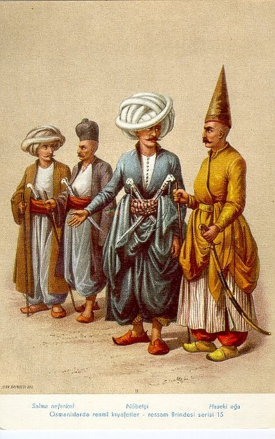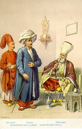 Несколько тысяч человек были сосредоточены непосредственно в султанском дворце. Внизу иерархической лестницы находились аджемиоглан (воспитанники школы при дворце) и ичоглан (султанские пажи). Далее следовали рикаб агаляр — «аги султанского стремени» (приближённые султана), к которым относились мирахыр-и-эввель — «главный конюший» (начальник султанских конюхов, берейторов, шорников и погонщиков верблюдов), бостанджибаши — «глава садовников» (начальник внутренней охраны дворца и летних резиденций на берегах Босфора), миралем — «главный знаменосец» (начальник стражи и музыкантов, которые сопровождают султана во время выезда), капыджиляр-кахаси — «главный привратник» (начальник дворцовых слуг и всего хозяйства), которому подчинялись капыджибаши (начальники привратников, исполнявшие к тому же важные и тайные поручения), хазинедарбаши (начальник личной казны султана). «Агам стремени» подчинялся огромный штат — заведующие различными хозяйственными и вспомогательными службами, входящими в структуру дворца (кухни, бани, склады, арсенал, монетный двор, архив, библиотека и т. д.), казначеи, писари, снабженцы (поставщики продуктов, вин, кормов для лошадей), ловчие, дворцовые гвардейцы, личные телохранители султана и принцев, их доверенные лекари. Наверху пирамиды находился корпус улемов — придворных учёных и богословов[62].