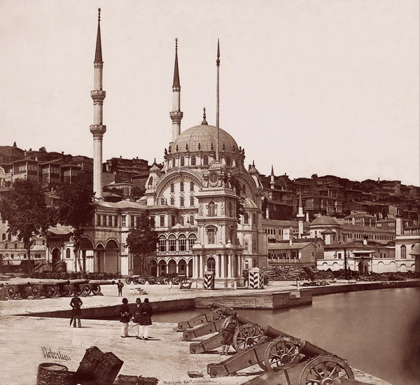 Также в 1845 году по приказу султана был построен деревянный понтонный мост, связавший противоположные берега Золотого Рога. В 1850 году стартовало пароходное сообщение через Босфор (изначально между Эминёню и Ускюдаром). В 1854 году завершилось строительство нового султанского дворца Долмабахче, обошедшегося истощённой казне в 70 млн франков (что превышало треть ежегодных поступлений в государственный бюджет). Он был возведён на европейском берегу Босфора, на месте небольшого залива, засыпанного землёй (отсюда и название — «Насыпной сад»). Автором проекта выступил Карапет Бальян — представитель знаменитой армянской семьи архитекторов Бальян, которая создала много зданий в Стамбуле. Во дворце насчитывалось свыше 300 комнат, каждая из которых была оформлена европейскими художниками непохоже на другую. Огромный тронный зал украшала хрустальная люстра весом около 4 тонн, подаренная султану русским царём. По желанию матери султана Абдул-Меджида возле крепости Анадолухисары был построен ещё один небольшой дворец для отдыха придворных. Также в 1854 году под руководством архитектора Никогоса Бальяна в стиле османского барокко была построена мечеть Ортакёй. Она расположена на берегу Босфора и украшена богатой резьбой по камню[254][255].