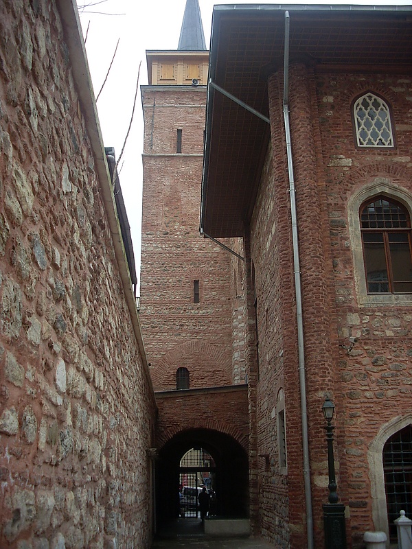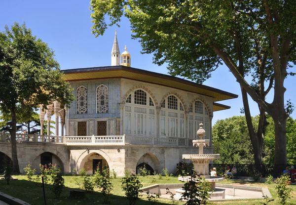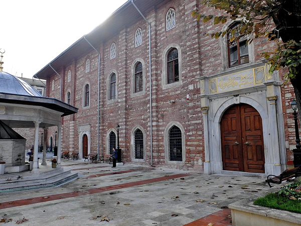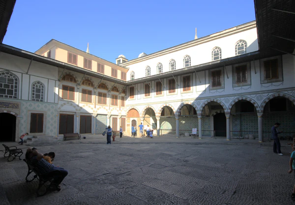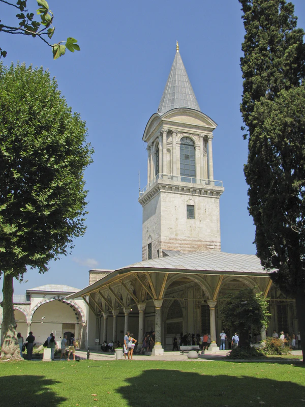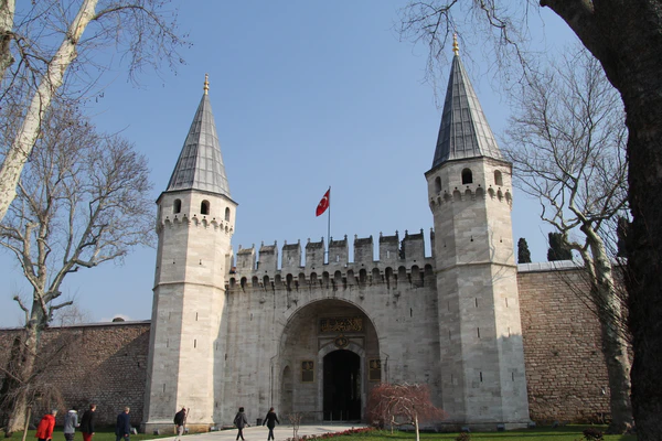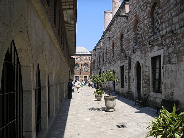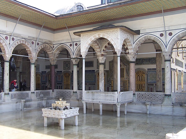 В эпоху правления Махмуда II дворцовый комплекс Топкапы приобрёл свой нынешний вид. Он был окружён высокой каменной стеной, внутри которой множество зданий и дворцов соединялись между собой мабейнами (открытыми террасами, крыша которых покоилась на столбах). Справа от Айя-Софии находились главные ворота дворца — Баб-и хумаюн (Высочайшие ворота), над которыми каждое утро выставлялись головы казнённых. От них, мимо бывшей церкви Святой Ирины, превращённой османами в оружейный склад, шла аллея, упиравшаяся в Средние ворота (Ортакапы) или Ворота приветствия (Баб эс-селям). В первом дворе размещались управления финансов, архивов и вакуфов, пробирная палата, имперское хранилище, дворцовый медпункт, конюшня для гостей, прибывших во дворец верхом, а также охрана и палачи, казнившие впавших в немилость сановников. Второй двор, известный как «дипломатический», окружала низкая галерея с мраморными колоннами. Здесь находились здание дивана с квадратной башней, откуда султан в торжественных случаях обращался к народу, различные службы (султанская канцелярия, государственная казна), комнаты для гостей и кухни дворца, а также сквер с фонтанами[237][238].