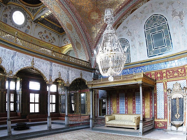 Заседания дивана проходили в здании Куббеалты («Шестикупольное») на территории Топкапы. В этих заседаниях принимали участие великий визирь, нишанджи (глава правительственной канцелярии и делопроизводства), башдефтердар (главный казначей империи), капудан-паша, кадиаскеры (или бейлербеи) Анатолии и Румелии (иногда на заседания приходил и султан, наблюдая за происходящим из небольшой ложи, отделённой от общего зала решёткой таким образом, что, оставаясь незримым для правительства, он видел и слышал всё происходящее). Изначально диван собирался каждый день после утренней молитвы и заседал до полудня, но с середины XVI века обычными стали собрания по субботам, воскресеньям, понедельникам и вторникам. При вступлении в должность новый великий визирь получал печать султана с его тугрой, которую всегда носил с собой на груди, а также свой двор с более чем 2 тыс. чиновников и слуг[комм. 11] (в истории не было примеров, чтобы претендент отказался от должности визиря или подал прошение об отставке с этого поста). Содержание канцелярии и двора великого визиря осуществлялось из личных средств сановника, но затем компенсировалось из казны, а также подношениями вступавших в должность лиц (джаизе), подарками просителей и доходами с Кипра, шедшими в личную казну визиря. Однако, после смерти или смещения с должности всё имущество великого визиря переходило в имперскую казну[63][64].