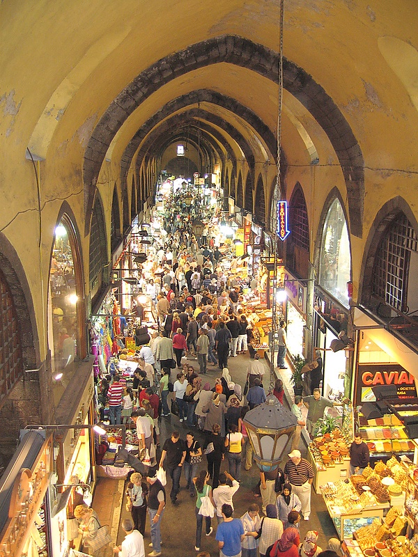 Кроме невольничьего существовали и другие специализированные рынки — по продаже лошадей, домашней птицы, живой и солёной рыбы[комм. 26], книг, специй, «блошиный рынок», а также еженедельные рынки-ярмарки: Салыпазары («рынок по вторникам») между Галатой и Топхане, Чаршамбапазары («рынок по средам») в Фетхийе, Першембепазары («рынок по четвергам») в Каракёй. По пятницам работали оживлённые рынки в районах Эдирнекапы, Ходжа Мустафа-паша, Кучук Мустафа-паша, Эюп, Касымпаша и Ускюдар, по субботам — в районах Алипаша (возле мечети Фатих) и Кулаксиз (в окрестностях Касымпаша), по воскресеньям — рынок Авретпазары, по понедельникам — рынок в районе Маджунджу. Но крупнейшим оставался Большой базар (Бююк чарши) или Крытый базар (Капалы чарши). Его сердцем были два старинных бедестана, вокруг которых располагались многочисленные хане (смесь гостиницы, офиса и склада), караван-сараи, таможенные склады, лавки и мастерские, а также пять мечетей и семь фонтанов. Базар представлял собой сеть из 67 пересекавшихся под прямым углом улиц, каждая из которых носила название цеха, обосновавшегося на ней (на некоторых перекрёстках существовали небольшие площади, на которых члены родственных цехов совершали совместные утренние молитвы). Всего на базаре работало 4 тысячи лавок, из которых около тысячи — в хане. В старом бедестане продавались шёлк, атлас, парча, бархат, ювелирные украшения, драгоценные камни, ковры, меха и фарфор, в новом — дорогие ткани, вышитые золотыми и серебряными нитями, шёлк и ангора. Все 18 ворот Большого базара вечером закрывались, после чего торговый комплекс оставался под надзором ночных сторожей, назначаемых цехами[158].