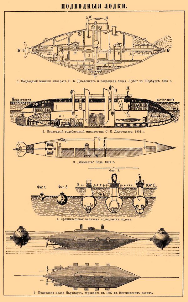 В России первые подводные лодки связаны с именем инженера С. К. Джевецкого.