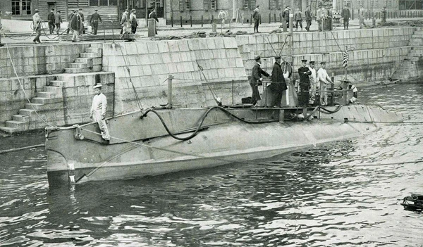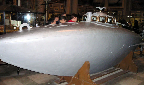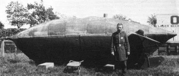 Английская подлодка Чэмпмена и Брина: они устроили особый газовый двигатель, в котором сжатый до 80 атмосфер кислород в соединении с нефтью представлял взрывчатую смесь; для погружения приспособили сильнодействующую центробежную помпу.