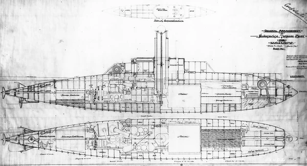 Лодка имела вид сигары, на которой сверху была поставлена блиндированная и суженная к оконечностям рубка, которая занимала около 1/3 длины всей подлодки; над ней возвышалась дымовая труба, а впереди её — небольшая броневая башня из 8-дюймовых гарвеированных плит. Длина подлодки 80', наибольший диаметр 11; крепость корпуса была усилена для погружения до 150 фт. При плавании подлодка могла иметь три положения: непогружённое, когда часть корпуса её видна над водой, при этом скорость хода достигала 15 узлов; полупогружённое — когда над водой остаётся лишь бронированная надстройка, башня и труба (скорость = 13 узлам); погружённое; при нём подводная лодка опускалась до 70 фт. ниже поверхности воды; тогда наибольшая скорость была определена в 8 узлов, при этом труба убиралась внутрь судна. В первом и втором положении движение судну сообщали 2 машины четверного расширения, развивавшие до 1800 I. Н. Р.; запас угля на 15 час. полного хода. В третьем положении, под водой, лодка шла сначала запасом пара, когда же пары падали, то батареями аккумуляторов, заряд которых = 6 часам подводного полного хода. В корме подводной лодки имелись три гребных винта.
