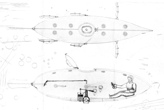 Англичанин Уильям Боурн (Борн) в 1578 году разработал проект подводной лодки[1]. Это должна была быть полностью закрытая лодка, обшитая водонепроницаемой кожей, которая бы приводилась в движение посредством гребли под водой.