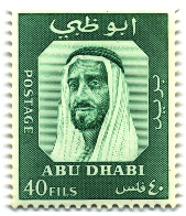 Первыми марками Абу-Даби была стандартная серия 30 марта 1964 года с изображением шейха Шахбата ибн Султана ан-Нахайяна и надписью «Abu-Dhabi» («Абу-Даби»). Было выпущено 11 номиналов в имеющей хождение индийской валюте. Номиналы варьировали от 5 новых пайс (англ. naye paise) до 10 рупий (rupee)[1].