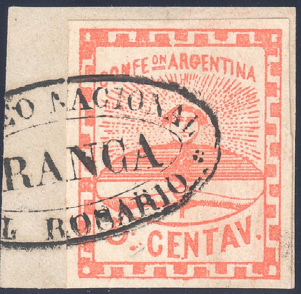 Появившиеся в 1858 году первые почтовые марки Аргентины как государства (Sc #1—4) представляли собой довольно примитивные, изготовленные литографировским способом миниатюры, на которых была изображена печать Аргентинской конфедерации[≡]. Надпись на марках гласила «CONFEon Argentina» («Конфедерация Аргентины»). В 1860 году марку в 5 сентаво переиздали[1].