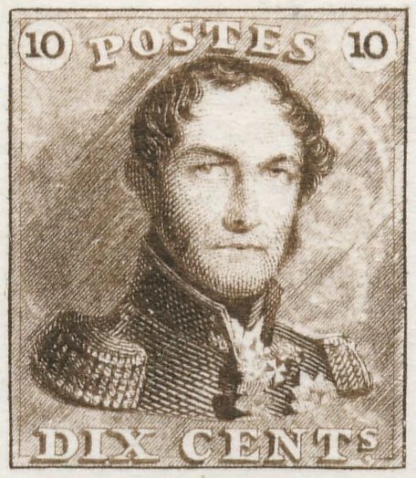 Первые национальные почтовые марки Бельгия выпустила в обращение 1 июля 1849 года[5]. Для этого была напечатана серия из двух беззубцовых марок: коричневой номиналом в 10 сантимов (для пересылки писем массой не более 10 г на расстояние не далее 30 км)[≡] и синей номиналом в 20 сантимов, их прозвали «Эполеты»[5]. Нарисовал марку художник-литограф Шарль Бонье, изобразив короля Леопольда I в военной форме с эполетами и взяв за основу портрет кисти Лиэвина де Винне. Название государства не указывалось, была только надпись «Postes» («Почта»)[5][≡].