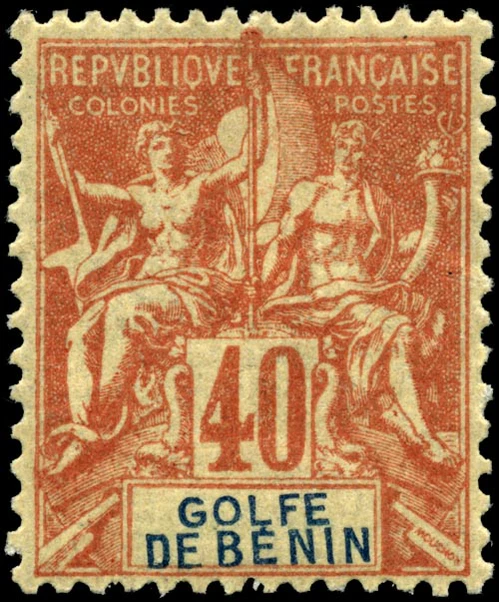 Первые собственные марки для французской колонии Бенин поступили в обращение в 1892 году[2][3]. Они представляли собой французские колониальные марки, на которых была сделана надпечатка текста «Bénin» («Бенин»). В дальнейшем выходили также почтовые марки оригинальных рисунков с такой же надписью[3]. На выпущенных в 1893 и 1894 году французских марках колониального типа были даны два отличающихся названия территории — соответственно «Golfe de Bénin» («Залив Бенина»)[≡] и «Bénin» («Бенин»)[2].
