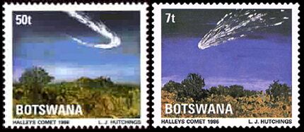 Комета Галлея на марках Ботсваны 1986 года номиналом в 50 и 7 тхебе