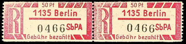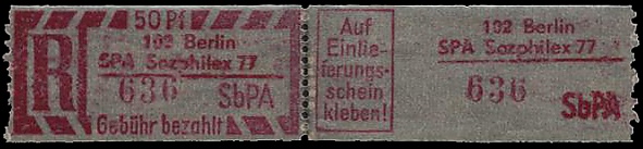 Первые заказные ярлыки для почтамтов самообслуживания с надписью «Gebühr bezahlt» («Тариф оплачен») и указанием стоимости 50 пфеннигов были выпущены в апреле 1967 года. На ярлыке также помещалось название почтового отделения, регистрационный номер и сокращение «SbPA» («Selbstbedienungs—Postamt» — «Почтамт самообслуживания»). Ярлыки существуют на обычной и пергаментной бумаге. В марте 1968 года был введён новый тип ярлыка. Последний, третий тип заказных ярлыков был выпущен в обращение в июле 1983 года[2][3][5].