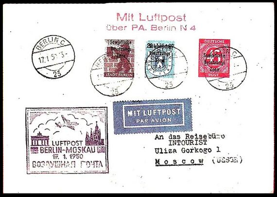 17 января 1950 года состоялся первый официальный полёт по линии Берлин—Москва, выполненный самолётом «Аэрофлота». Самолёт доставил в Москву почту, отмеченную специальным фиолетовым штемпелем с изображением Бранденбургских ворот в Берлине и Спасской башни Кремля в Москве. Для оплаты этой почты использовали марки ГДР, выпущенные в октябре 1949 года, а также марки советской зоны оккупации Германии. Письма, доставленные первым рейсом «Аэрофлота», являются весьма редкими[13].