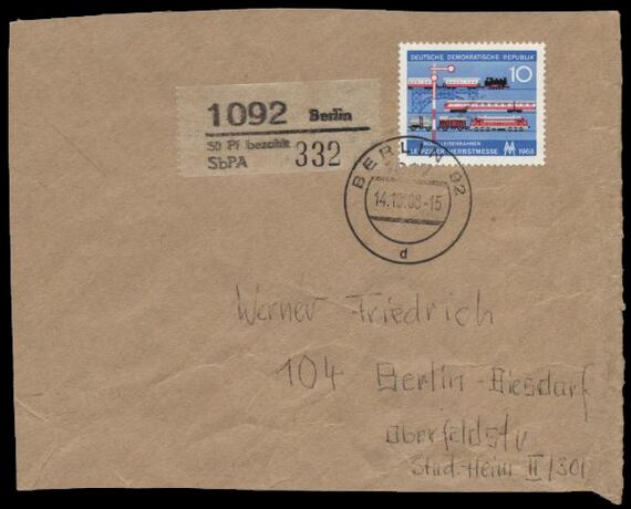 В мае 1968 года был выпущен ярлык для почтамтов самообслуживания стоимостью 50 пфеннигов для оплаты посылок. С 14 апреля 1969 года посылочные ярлыки запретили использовать для франкировки посылок в Западный Берлин и на территорию ФРГ. Самообслуживание отправки посылок было приостановлено в 1970 году из-за высоких расходов и малого использования автоматов населением[2][3].