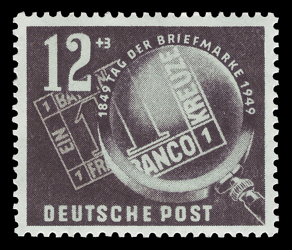 Первая марка Германской Демократической Республики, после основания этого государства, вышла 9 октября 1949 года. Она была посвящена 75-летию Всемирного почтового союза[3][5].