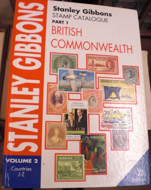 Каталог «Стэнли Гиббонс» (красный, 2001) для Великобритании и Содружества, на обложке которого в правом нижнем углу можно увидеть марку Британской Южно-Африканской компании 1913 года с портретом короля Георга V и номиналом в 1 фунт стерлингов (SG #279)