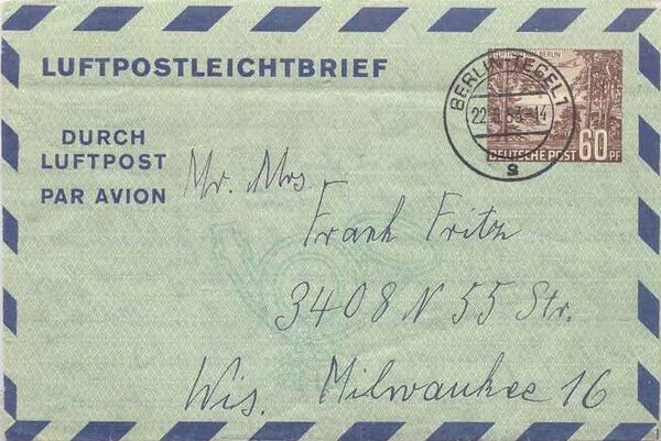 Почтой 3ападного Берлина с 1948 по 1953 год было выпущено шесть аэрограмм. Они использовались до 31 декабря 1954 года.[2][4]