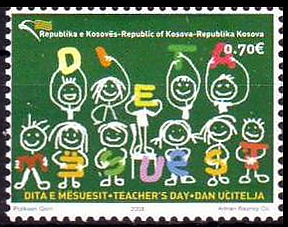 Первые марки частично признанной Республики Косово вышли вскоре после провозглашения независимости — 7 марта 2008 года. Серия из двух миниатюр посвящалась Дню учителя. На них была дана надпись на трёх языках албанском, английском и сербском (латиницей): «Республика Косово», номинал указан в евро.[6]
