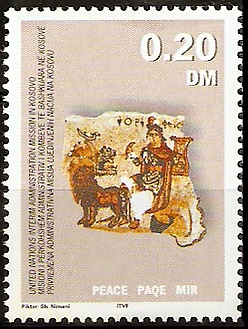 15 марта 2000 года Временная миссия ООН в Косове (англ. United Nations Interim Administration Mission in Kosovo, UNMIK) выпустила в обращение первые собственные марки — пять номиналов с изображением ценных археологических находок. На миниатюрах была дана надпись на трёх языках английском, албанском и сербском (латиницей): «Временная миссия ООН в Косове», номиналы указаны в немецких марках. Отправка простого письма в пределах территории Косова обходилась в 30 пфеннигов. В день выхода марок на главном почтамте Приштины использовался специальный штемпель первого дня. Первый выпуск марок UNMIK назвали впоследствии «марками Кушнера» по имени шефа Временной миссии ООН Бернара Кушнера.[3][4]