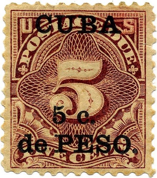 - американская карточка с портретом президента США Джефферсона, номиналом в 1 цент и с надпечаткой текста «CUBA.-1c. de Peso.» и