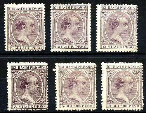 Первыми почтовыми марками Кубы были совместные выпуски с Пуэрто-Рико, вышедшие в апреле 1855 года[4]. Этот выпуск называется «антильским» («Antilles»)[5]. Первое время на всех стандартных марках был изображён портрет Изабеллы II до её отречения в 1868 году. Надписи на колониальных почтовых марках гласили: «Correos» («Почта»), «Plata» («Серебром»), «Ultramar» («Заморские владения»). С 1873 года стали выпускаться отдельные марки испанской колониальной администрации для Кубы[6]. Однако до 1876 года на них сохранялась надпись «ULTRAMAR» («Заморская территория»)[≡], впервые слово «CUBA» («Куба») появилось на почтовых марках в 1877 году[7].