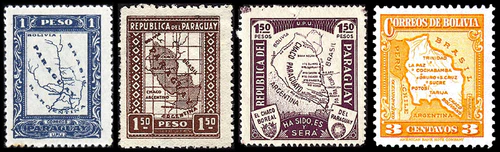 Подборка почтовых марок Парагвая и Боливии с их картами времён конфликта за плато Гран-Чако: Парагвай — 1924, 1927 и 1932 (Sc #254, 292 и 323); Боливия — 1928—1935 (Sc #220). На марке Парагвая 1924 года граница с Боливией не указана, в 1927 году — проходит севернее Гран-Чако, в 1928 году — продвинута ещё дальше с обозначением территории как «Северное Чако Парагвая» и лозунгом «Было, есть и будет (парагвайским)»[≡]. На марке Боливии спорная область названа «Боливийское Чако»