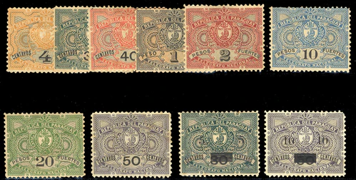 По данным Л. Л. Лепешинского[3], всего за первые почти сто лет, с 1870 по 1963 год, было эмитировано 1105 почтовых марок и 12 почтовых блоков. При этом на них присутствовали надписи: «Republica del Paraguay» («Республика Парагвай»); «Union Postal Universal», «UPU» («Всемирный почтовый союз», «ВПС»); «Correos» («Почта»).