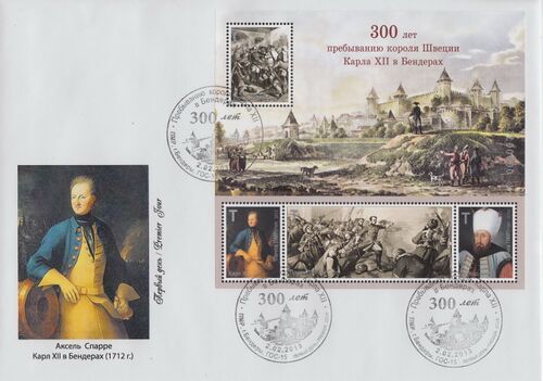 Конверт первого дня, подготовленный к изданию почтового блока в честь 300-летия пребывания шведского короля в Бендерах (2013)