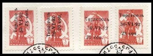 В июне 1992 года по заказу Тираспольского узла связи на стандартные марки СССР были нанесены типографские надпечатки в три строки: «Тирасполь / 30-VI-92» и новые номиналы «20 коп.» и «28 коп.». Надпечатки были чёрного (марка СССР (ЦФА [АО «Марка»] № 4735)) и красного (в оттенках от ярко-красного до бледно-красного) цветов (марка СССР (ЦФА [АО «Марка»] № 6145)). На нижнем поле листа были расположены надписи на русском и украинском языках «Почта Приднестровья», между ними указан тираж: «150 тыс.». Оба номинала надпечатывались в одном листе, при этом на верхних рядах надпечатки горизонтальные; на нижних пяти рядах надпечатки снизу вверх (вертикальные):