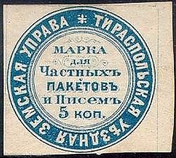 Доставка частной корреспонденции оплачивалась земскими марками, которые выпускались в 1873 году (имели круглую форму) и в 1879 году (прямоугольной формы с изображением уездного герба). Марки гасились перечёркиванием чернилами. В 1875 году для использования на служебной (казённой) корреспонденции были выпущены бесплатные служебные облатки, но они не имеют отношения к знакам почтовой оплаты[4].