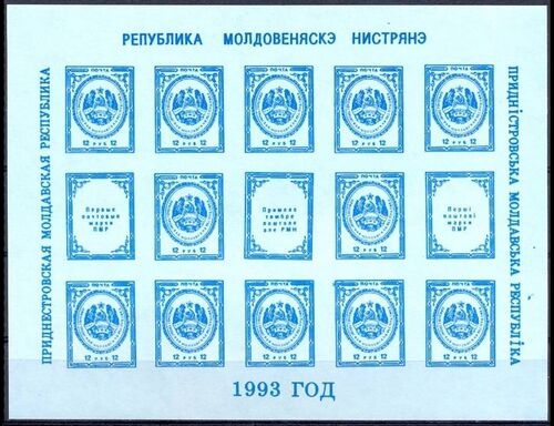 31 декабря 1993 года первая почтовая марка ПМР номиналом в 12 рублей поступила в обращение на всей территории непризнанной республики. Миниатюры были отпечатаны в малых листах по 12 марок и три купона в листе на белой бумаге с голубым фоном без зубцов и без клея, тиражом 360 000 экземпляров (30 000 малых листов)[9]: