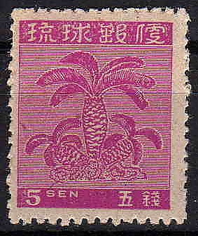 Первая серия стандартных марок островов Рюкю была выпущена 1 июля 1948 года[1][3]. Серия включала марки номиналом от 5 сенов до 1 иены, на которых были изображены джонка, крестьянин и другие сюжеты. Всего вышло два тиража: на серой и белой бумаге. Надписи были на японском языке: яп. «琉球政府». Марками могла оплачиваться пересылка внутренних почтовых отправлений, а также корреспонденции, направляемой в Японию и США. Пересылка почтовых отправлений в другие страны мира оплачивались наличными. Однако уже с января 1950 года почтовые марки применялись для оплаты любых почтовых отправлений[2].