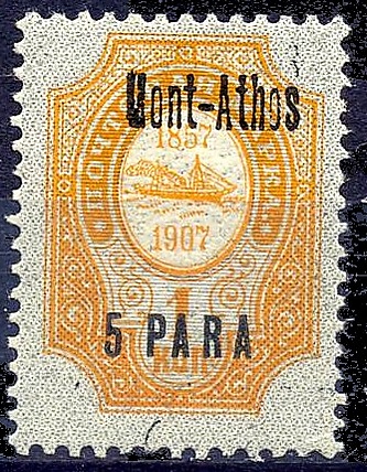 В 1909 году РОПиТ выпустило к полувековому юбилею своей ближневосточной почты серию из девяти специальных почтовых марок с дизайном[en], аналогичным общеимперскому стандарту, но с изображением парохода и юбилейных дат в центре вместо государственного герба. Марки надпечатывались номиналом в турецкой валюте и названиями каждого зарубежного отделения РОПиТ по-французски — в том числе Mont-Athos («Гора Афон»). Второй выпуск этой серии (1910) имел русскоязычные надпечатки — «С. Аѳонъ»[34].