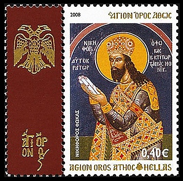 По словам главы филателистической службы Греческой почты Василиоса Лукаса, целью эмиссий особых марок Святой Горы Афон является повышение всемирной узнаваемости этого уникального места, истории, архитектуры его монастырей, их реликвий, самобытного образа жизни их насельников, флоры, фауны и природных красот региона[13]. На самой первой почтовой марке Святой Горы, выпущенной 16 мая 2008 года и имеющей номинал €0,40 (Sc #1), изображён византийский император Никифор II Фока[10].