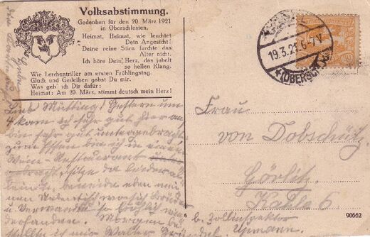 С целью повлиять на ход и результаты проходившегося в 1921 году плебисцита прогермански настроенные местные организации прибегли к распространению в Верхней Силезии германских пропагандистских марок. Подоплёкой к таким действиями служил тот факт, что в этом промышленно развитом районе проживало смешанное немецко-польское население и к нему проявлялся большой интерес со стороны Германии. Пропагандистские миниатюры представляли собой польские почтовые марки (Sc #A12, A13 и A14), на которых были произведены надпечатки на немецком языке в три строки: «Достойные немцы голосуют за Германию!», а также новые номиналы — в 7, 21, 42, 70 и 140 пфеннигов. Марки не поступали в почтовое обращение, а средства от их продажи направлялись в агитационные фонды.