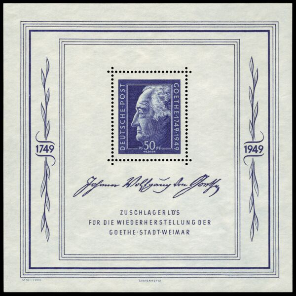 С августа 1948 года стали выпускать марки оригинальных рисунков с надписью «Deutsche Post» («Немецкая почта»). Первые марки с оригинальным рисунком были посвящены Лейпцигской осенней ярмарке. Это был также первый почтово-благотворительный выпуск СЗОГ. В январе 1949 года вышла первая коммеморативная марка, посвящённая 30-летию со дня смерти Карла Либкнехта и Розы Люксембург. В августе того же года был выпущен почтовый блок в честь праздничных недель Гёте в Веймаре. Марки СЗОГ изымали из обращения в два этапа — в июне и в декабре 1951 года[6][16].
