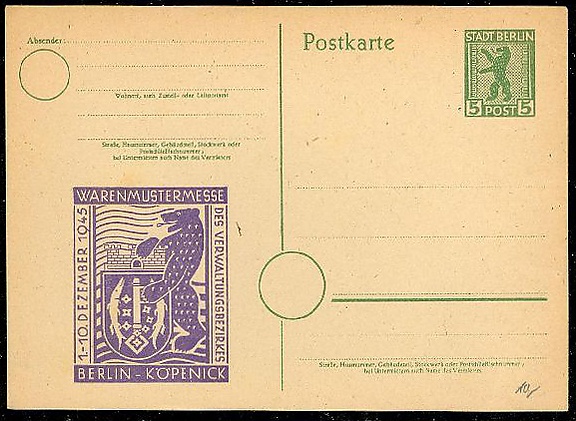 ГПД Берлина были выпущены также почтовые карточки. Существует два вида карточек. Первый отличается отсутствием кружка для почтового индекса. Второй выпуск напечатан на бумаге пяти разных сортов. Карточки второго выпуска известны также с частной надпечаткой «1-10 Dezember 1945. Warenmustermesse des Verwaltungsbezirkes Berlin-Köpenick» («1—10 декабря 1945 года. Ярмарка образцов административного района Берлин-Кёпеник») изображением геральдического медведя с гербом Кёпеника. Надпечатки сделаны в четырёх цветах[2].