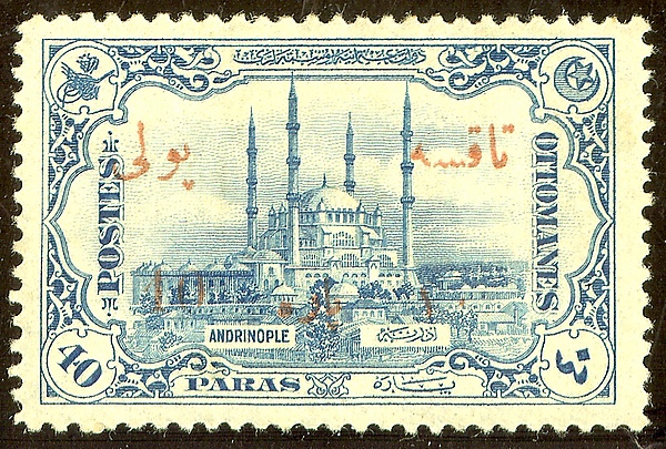 В 1880—1909 годах в недолгом местном обращении в Константинополе, Смирне и некоторых других городах находились надпечатанные марки Османской империи. Надпечатки содержали новую стоимость или памятные надписи[13]. Так, в феврале 1909 года впервые были отдельно изданы марки с надпечаткой «CONSTANTINOPOLI» («Константинополь»)[9].