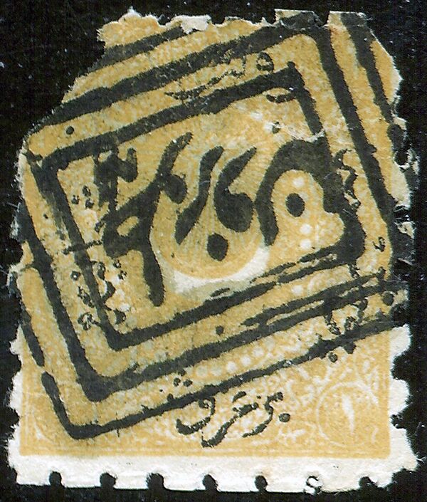 Ранние штемпели были с белыми арабскими буквами на цветном фоне[13], что создавало эффект гашения «штампом-негативом». Как правило, это круглый штамп, на оттиске которого арабская графика остаётся без краски (белой) на чёрном фоне.