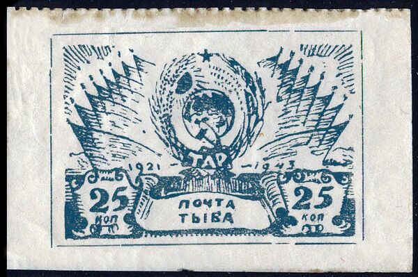 Последний, двадцать первый, выпуск марок Тувинской Народной Республики состоялся во второй половине 1944 года. Он был обусловлен нехваткой марок 25-копеечного достоинства и представлял собой повторение марки 20-го выпуска с изображением герба ТНР в изменённом цвете (серо-синяя) (Yt #102). Марки этого издания были в обращении короткое время и чаще встречаются в негашёном виде[1][10].