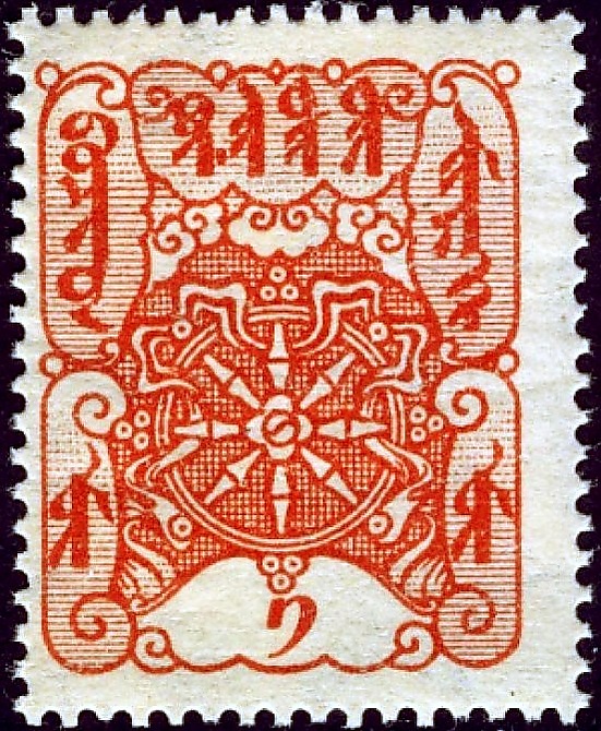 Первый выпуск почтовых марок Тувы состоялся в конце октября 1926 года. Миниатюры были отпечатаны литографским способом. Выпуск состоял из 10 одинаковых по рисунку, но разных по цвету марок. На всех миниатюрах было изображено буддийское «Колесо счастья» (также фигурировало в первом гербе республики). Номинал марок был от 1 мунго (копейки) до 5 тугриков[5]. Все надписи сделаны с использованием старомонгольского уйгурского письма. Все марки были изготовлены на Московской печатной фабрике «Гознак» и печатались на стандартных листах по 100 штук. Марки поступили в обращение 8 февраля 1927 года, все они на конвертах и других отправлениях, прошедших почту из Тувы, редки. Филателистические (фиктивные) гашения марок данного выпуска были выполнены в Москве дубликатом штемпеля чёрной краской с различными календарными датами от 1926 по 1929 год[1].
