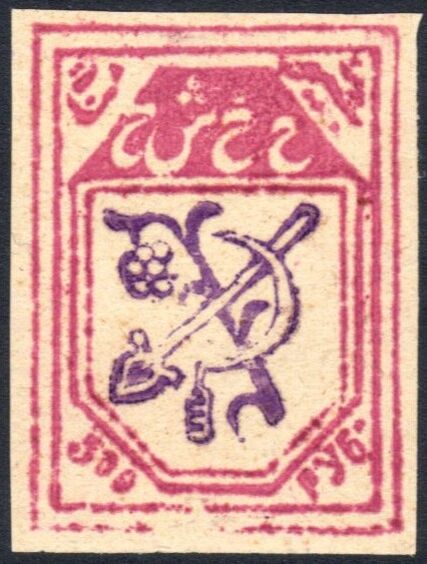 В 1921 году для использования в почтовых учреждениях внутри республики были отпечатаны марки номиналом 500 рублей с изображением символов крестьянского труда — серпа, лопаты и веточки джугары (сорго)[3]. Надписи выполнены арабским шрифтом. Номинал указан на русском языке[2].